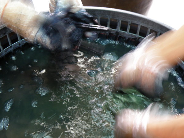 4. 在大菁溶液內漂染3分鐘,剛開始布料浸染成綠色,接著拽乾