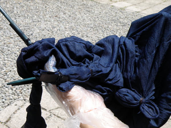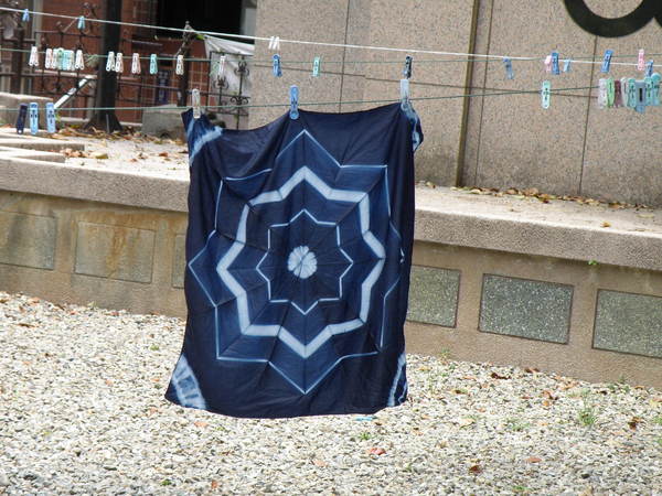 5. 拿到陽光下曝曬並盡量撥開布料,讓染劑氧化,顏色會由綠轉藍