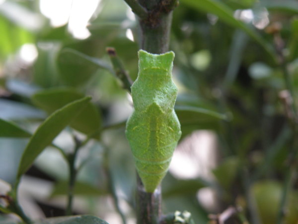 《小桔子樹上無尾鳳蝶幼蟲蛹期~正面》