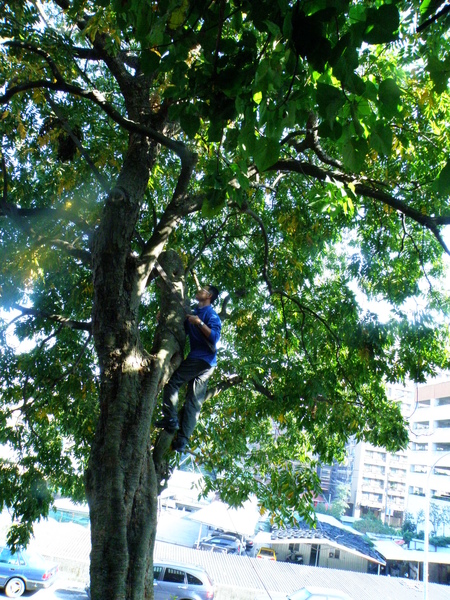 的一個人,爬到好高好高的樹上,哇!今天大豐收,