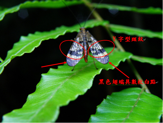 原來它是長翅目蝎蛉科的蝎蛉,前翅有一枚Y字型斑紋、