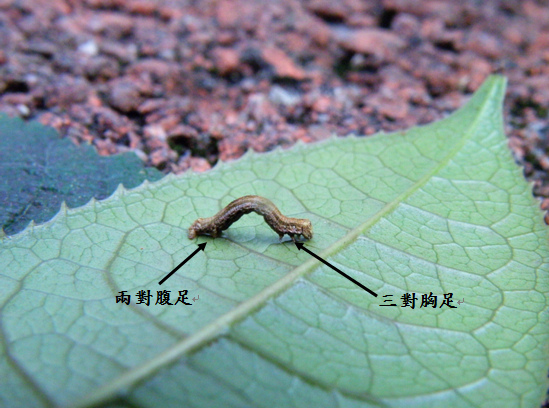 兩對腹足〈它是尺蠖蛾的幼蟲,而蝴蝶幼蟲則有五對腹足〉,
