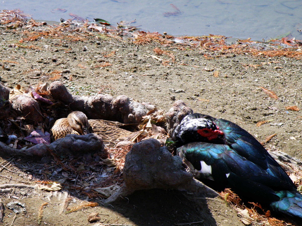 《一群紅面番鴨以落羽松膝根當巢穴》
