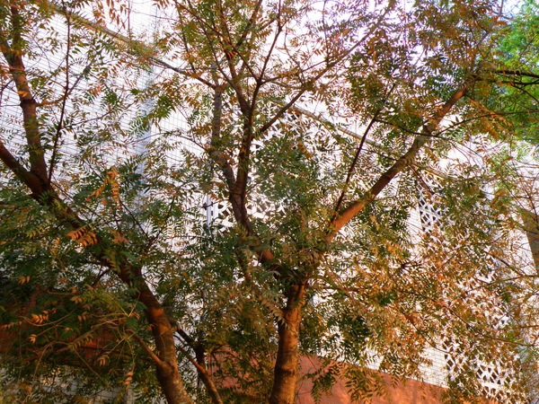 冬日黃葉在夕陽餘暉照映下,黃連木硬是柔和了那一面冷冰冰的