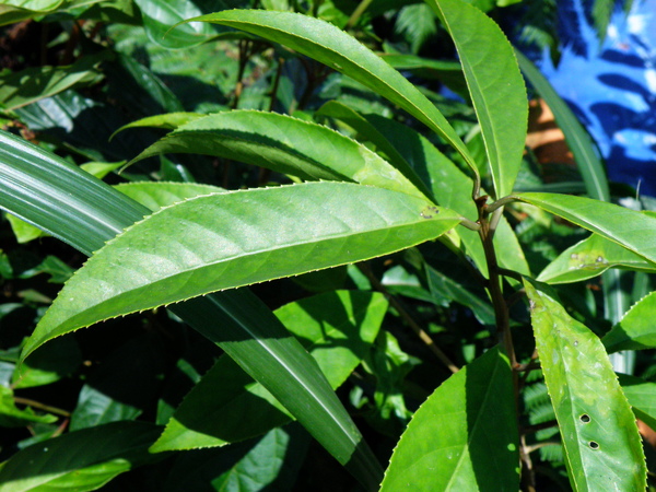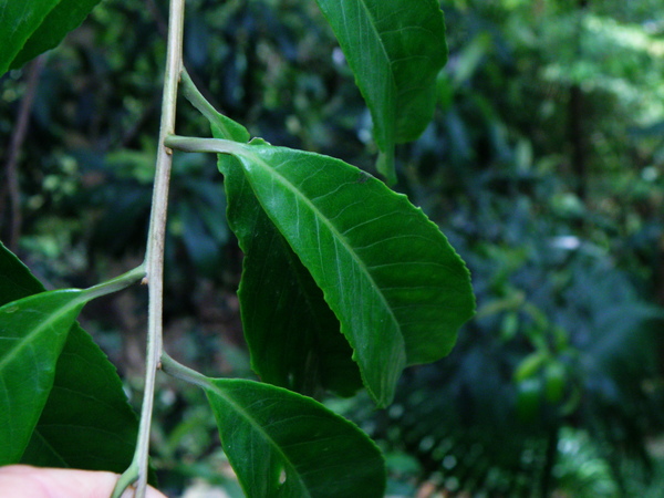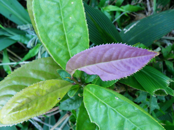 它是單葉互生、革質、葉柄狹長稍帶紫色、葉端尾尖、