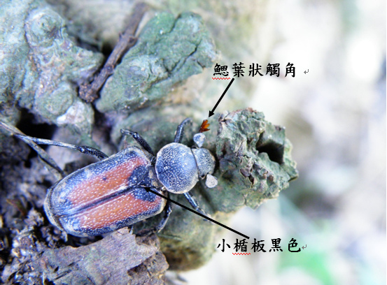 大衛細花金龜前胸背板黑色,翅鞘具橙褐色條狀斑紋,小楯板