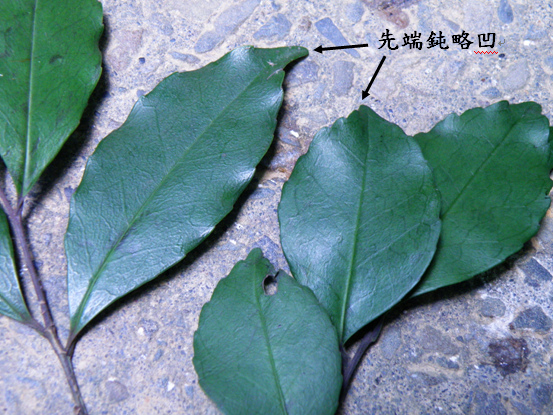 革質、疏鋸齒緣、先端鈍略凹、葉型變化大。