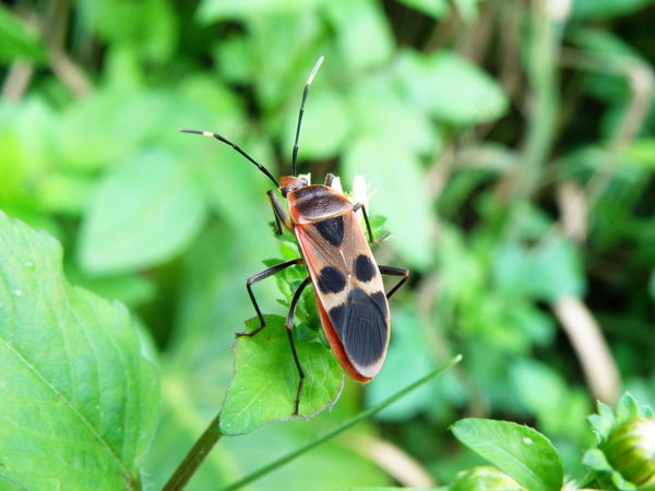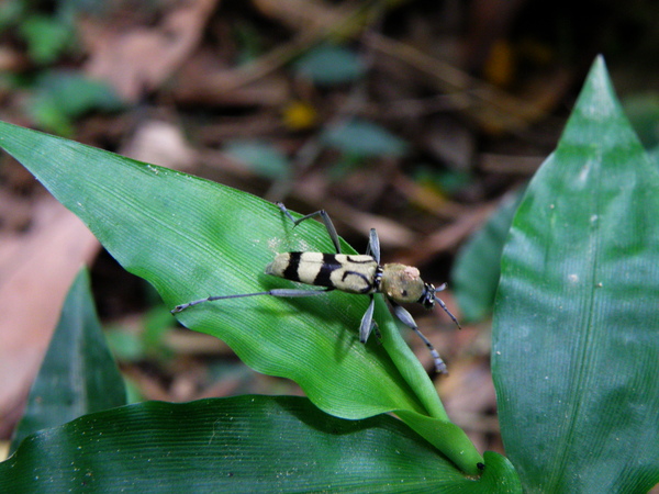 前胸背板和頭部約略等大、各腳黑色、觸角呈鞭狀、翅鞘