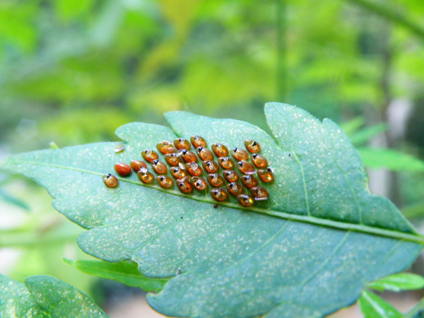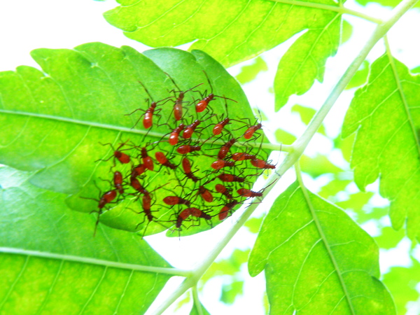 紅姬緣椿象卵,同時間也有一大群紅姬緣椿象若蟲,高度聚集