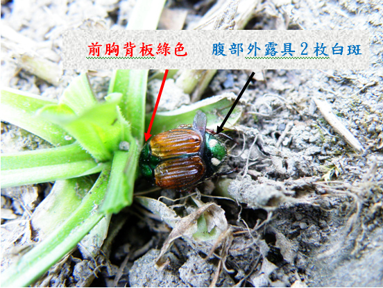 綠色,腹部末端外露具2枚白色斑紋。是數量多見的