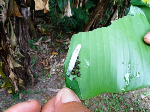 香蕉弄蝶幼蟲就在其中。蟲兒頭好壯壯,糞便也特大一顆顆,