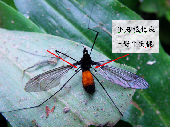 中間橙黃色,翅膀透明,下翅退化成一對平衡棍,各腳黑色、