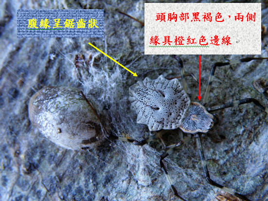 屬於金蛛科的裂腹蛛,頭胸部黑褐色,兩側緣具橙紅色