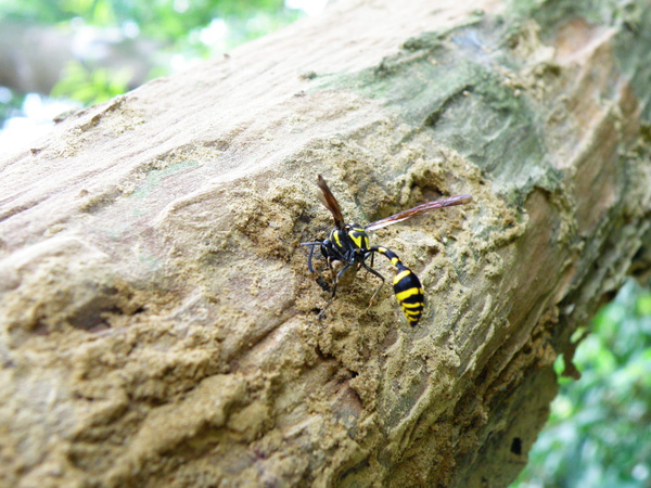 蟲兒,難以細數,一隻停棲樹幹上的棕長腳蜂,從其姿態