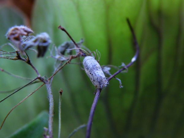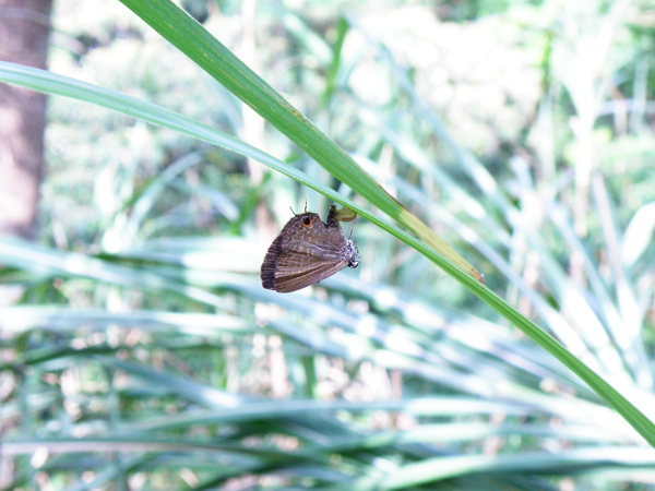 颱風草葉背怎麼倒掛一隻琉璃波紋小灰蝶呢?仔細近看,原來它