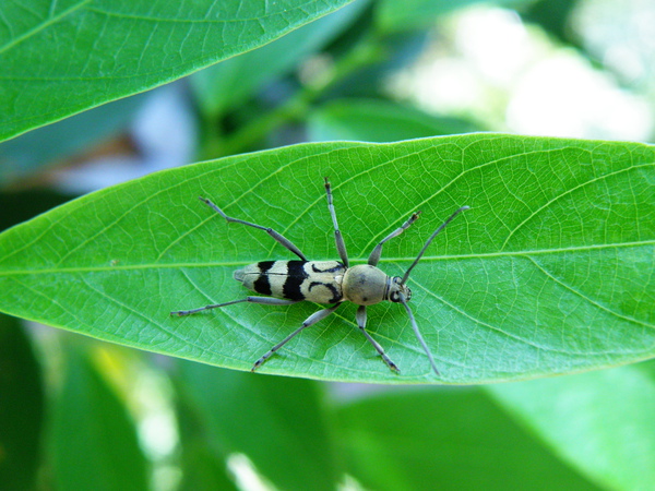 淡黑虎天牛體色灰綠,體表布滿短毛,翅鞘具三列黑色斑紋,其中