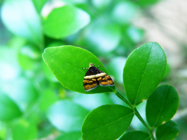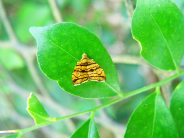 七里香葉片上黃翅桑舞蛾處處有,前翅近基部黑色,停棲時呈