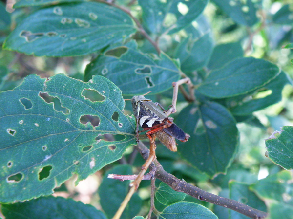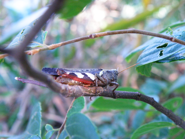 ~短角異斑腿蝗,體背黑色,後腳腿節外側具黑白的斑紋,