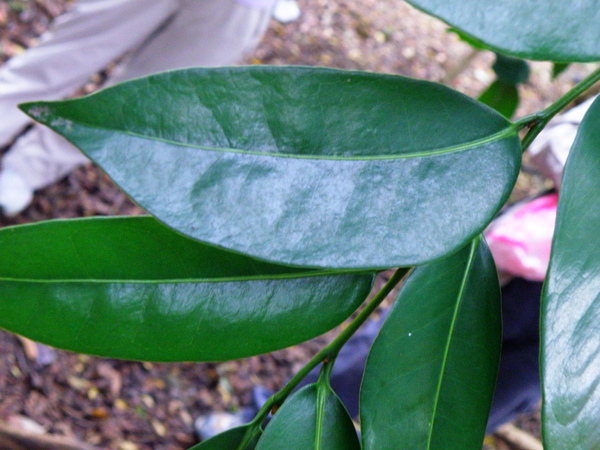 單葉互生,基部鈍中肋歪斜,葉表光滑無毛,頗具光澤,革質,