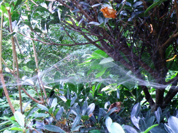 灌木、草叢 、枯木枝條上,結層層疊疊極富立體感的斗笠網,