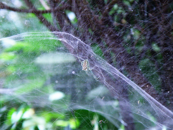結在枝葉間又像透明的薄紗。雌蛛體型碩大,腹背橙黃色外加