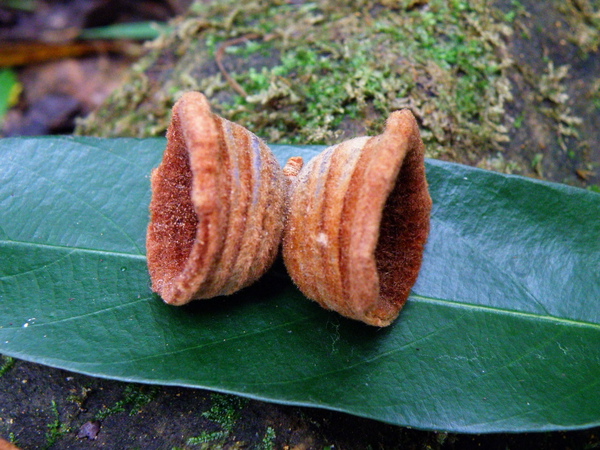 先端微凹。暗紅褐色長圓筒狀有毛的蒴果,因形狀似