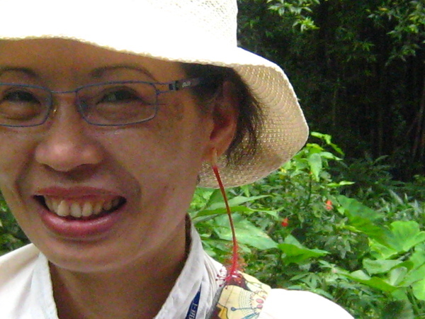 一堆歐巴桑、歐哩桑看到扶桑花,還是天真的玩起來,