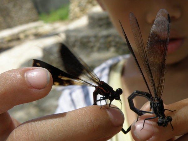 最後,在溪邊他徒手一抓短腹幽蟌一對,