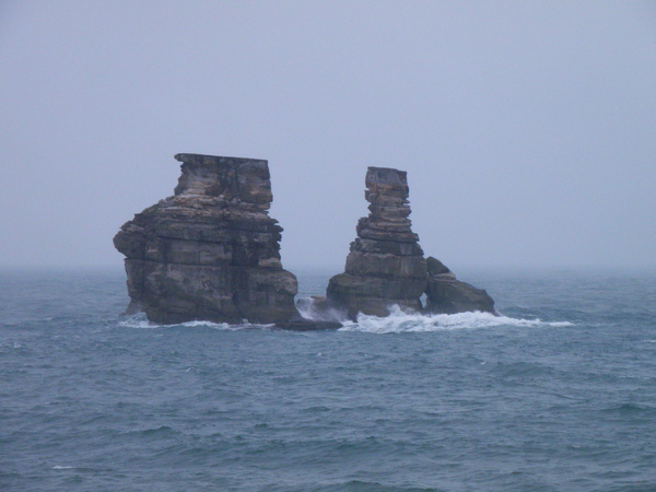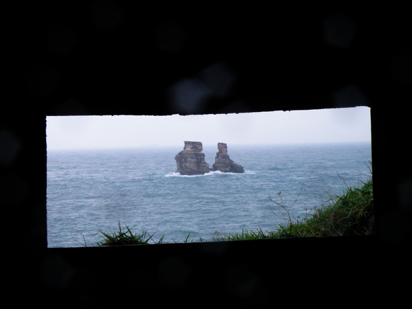 昔日留下的軍事遺跡碉堡的框景,更有驚濤駭浪中